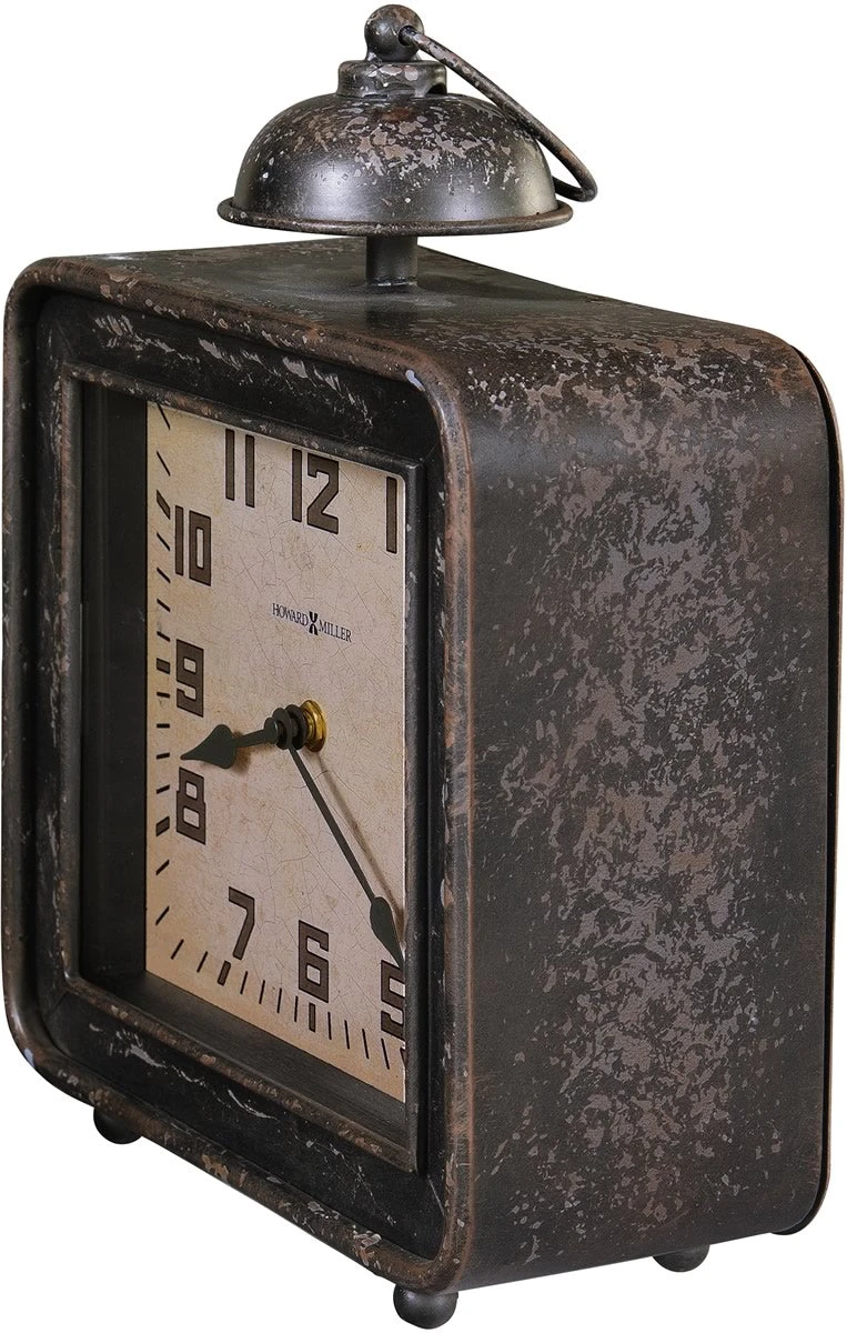 This square metal mantel clock is finished in antique black and features rounded corners, round ball feet and a decorative, faux bell on top of the case. An aged dial with charcoal Arabic numerals and minute track features charcoal gray finished spade hour and minute hands and sits behind a glass crystal. Quartz, battery-operated movement requires one AA sized battery (not included). Height 12.75″ (32 cm) Width 9″ (23 cm) Depth 5″ (13 cm)