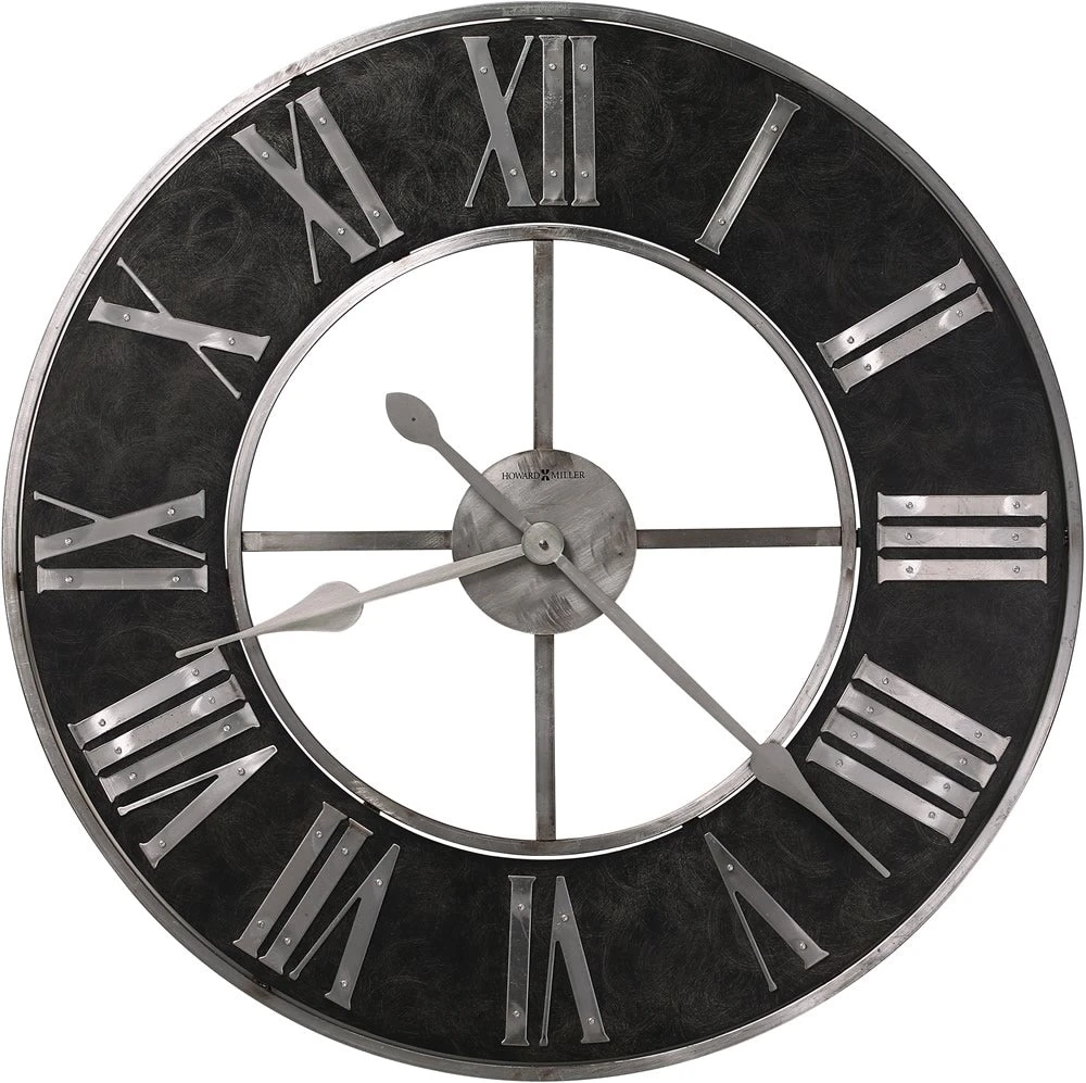 This industrial looking 32″ wall clock has a machined, steel frame with grind-marks as distressing. The machined and blackened steel numeral ring also features grind-marks and machined steel Roman numerals. The spade-shaped hour and minute hands are finishes in satin steel. Quartz, battery-operated movement requires one AA sized battery (not included).Diameter 32″ (81 cm) Depth 2″ (5 cm)