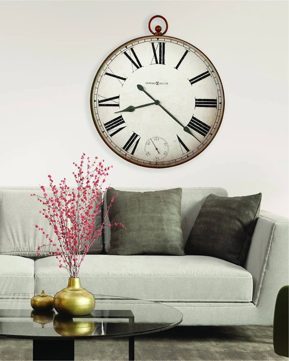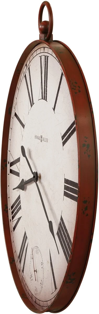 This oversized gallery pocket watch style wall clock is 32″ in diameter and features an aged red finish. The dial has a distressed antique white background with aged and distressed black Roman numerals and a separate seconds track at the “6” position. Spade-shaped hour and minute hands are finished in aged black. Quartz, battery-operated movement requires one AA sized battery (not included). Height 36.5″ (93 cm) Width 32″ (81 cm) Depth 2.25″ (6 cm)