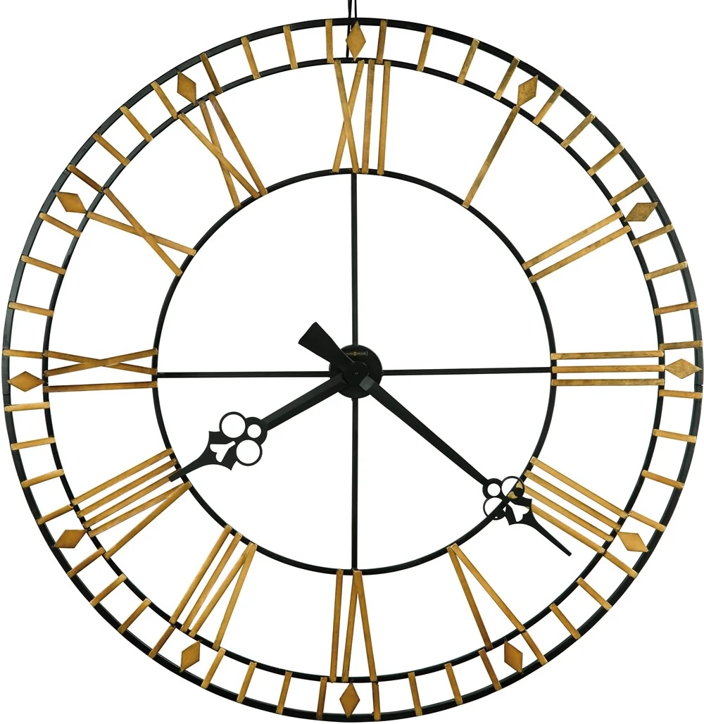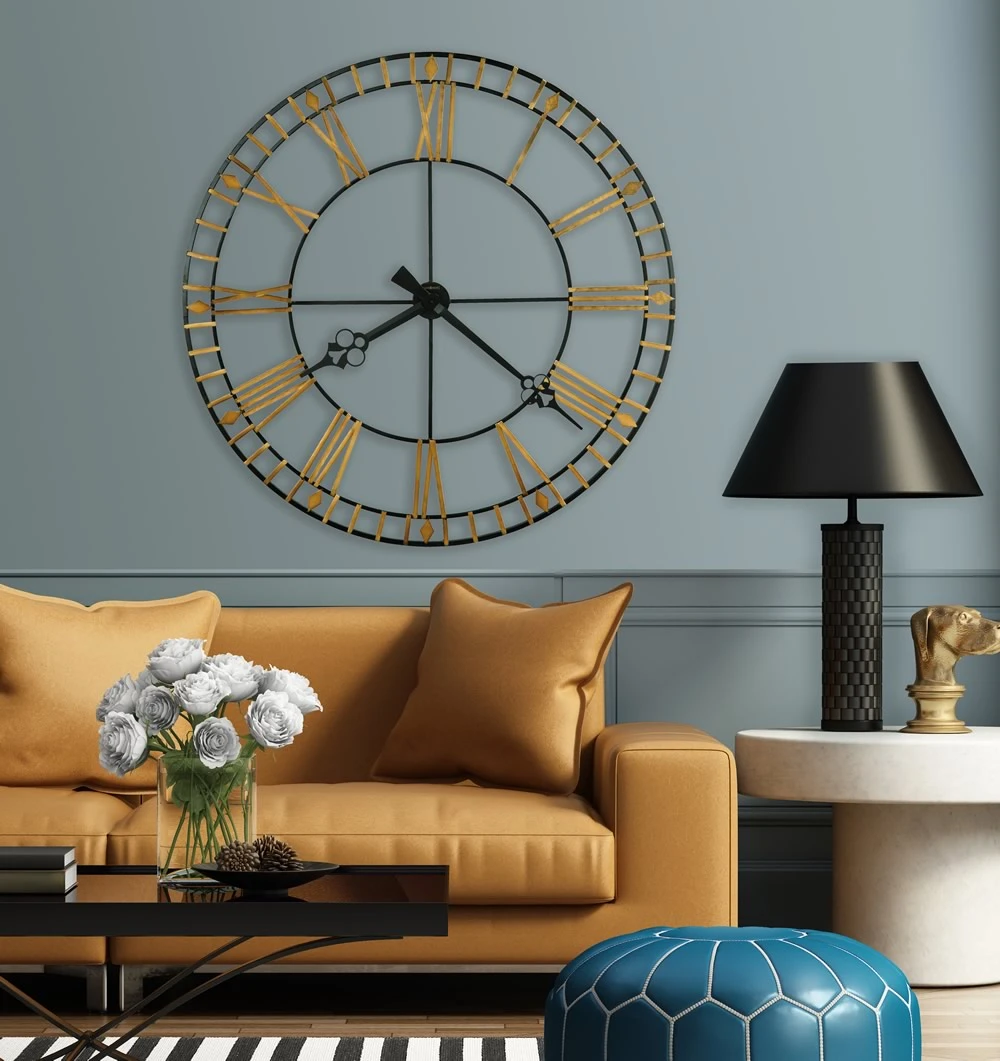This oversized, black and antique gold finished, wrought iron wall clock is 46.5″ in diameter and features applied antique gold finished Roman numerals with minute track and diamond hour markers. Quartz, battery-operated movement requires one AA sized battery (not included). Some assembly required. Diameter 46.5″ (118 cm) Depth 2.5″ (6 cm)