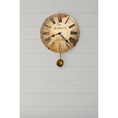 - Hints of the Past: Traces of its rich heritage and dynamic history are never far. At a single glance, this beautifully designed wall clock captures attention with its intricately finished antique dial. It’s meticulously mounted on a quarter-inch-thick, laser-cut panel base and is marked by antique black Roman numerals and hands. Situated 5″ beneath the dial is an eye-catching antique pendulum.
