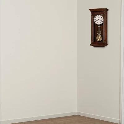 - Old-World Elegance: At a glance, it’s difficult to resist the outward beauty and timeless appeal of this antique wall clock. It’s finished in Handsome Cherry on select hardwoods and veneers and features a distinctive decorative overlay that crowns the arched glass. Eye-catching dentil molding borders the pediment and base. This traditional wall clock with a pendulum is the perfect addition to any classically designed space.