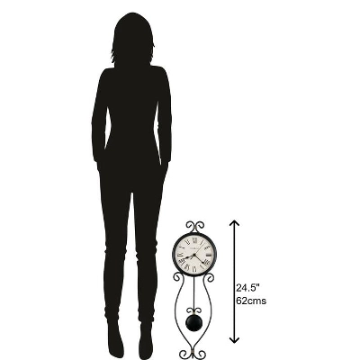 - HIGH QUALITY: The circle design will ensure you can read the time anywhere in the room. Easily tell time with black traditional Roman numerals (IIII instead of IV), black spade hands, antique black bezel, and convex crystal to stand out over an aged dial. The black pendulum bob is suspended on a bent wire with a gold accent.