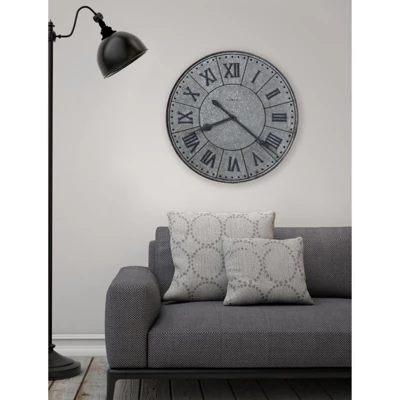 - Distinctive Details: It’s the little accents that lend this metal wall clock such prestige. Take in the aged finish that defines its character along with the strength and durability of its steel material. The dial is a handsome work of art, featuring metal dividers finished in charcoal gray. They provide separation or the applied metal Roman numerals, which are finished in complementary charcoal gray. There’s also a minute track and aged black spade hour and minute hands. The effect of this galvanized metal wall clock is at once commanding and approachable.